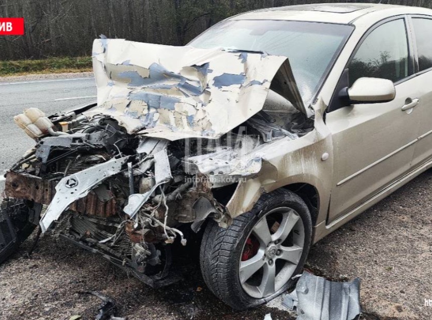 Столкновение автомобиля Mazda и грузовика произошло в Плюсском районе недалеко от поворота в деревню Большие Льзи со стороны Санкт-Петербурга.