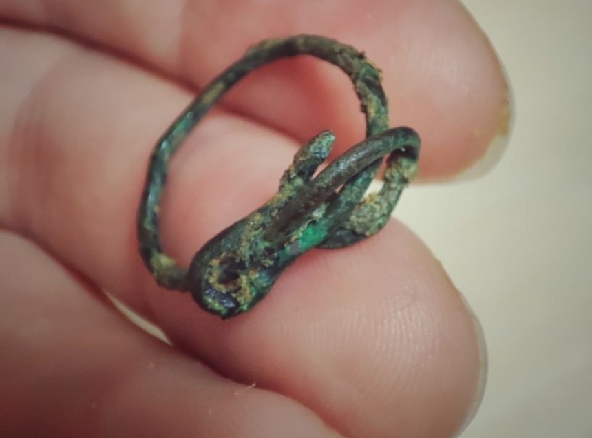 Еще одной находкой стал, предположительно, детский перстень. Археологи нашли его на Введенском первом раскопе. Перстень с узелком скрутили из медной проволоки.