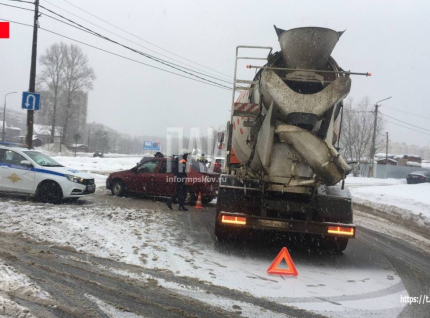 Столкновение бетоновоза и Renault Logan произошло у дома №118 по улице Ипподромной в Пскове 13 декабря.