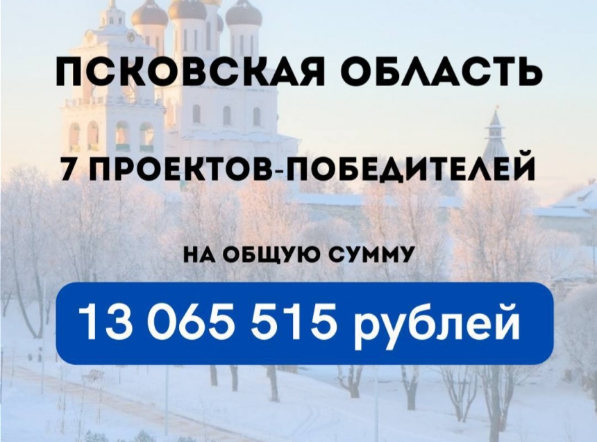 Приход храма Александра Невского с проектом «Ковчег добра» получил 4,9 миллиона рублей, частное учреждение «Детская деревня – SOS Псков» с проектом «Моя семья – моя опора» - 2,5 миллиона рублей, приход храма Святителя Луки Крымского при Псковской городской больнице с проектом «Служба милосердия – качественный уход, социально-бытовая помощь тяжелобольным людям с дефицитом самообслуживания» - 1,9 миллиона рублей, Псковское региональное отделение ВТОО «Союз художников России» с проектом «Земля Псковская – наш общий дом» - 939 тысяч рублей, АНО СЦ «Дети индиго» с проектом поддержки детей из семей военнослужащих и участников СВО «Я с тобой» - 948 тысяч рублей, АНО «Центр развития «Вектор» с проектом «Интеллектуальная перезагрузка 55+» - 852 тысячи рублей, ПООО «Федерация Джиу Джитсу» с проектом «Джиу-джитсу для всех» - 851 тысяча рублей.