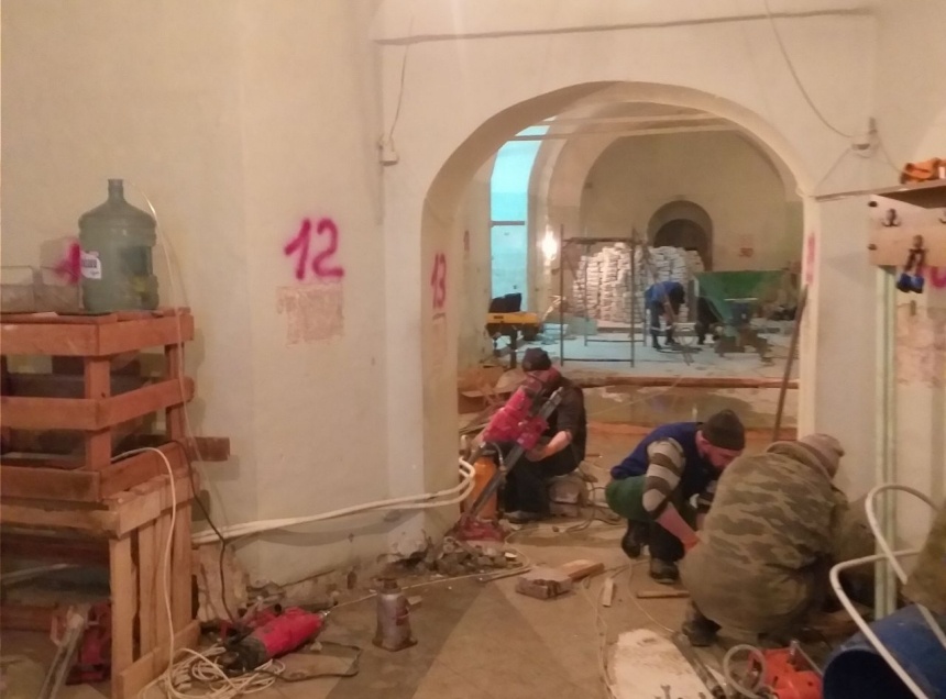 Сейчас в пределе проводят работы по инъектрованию стен и фундаментов. До этого были удалены разрушенные элементы кладки, штукатурных слоев, прогнивших полов.