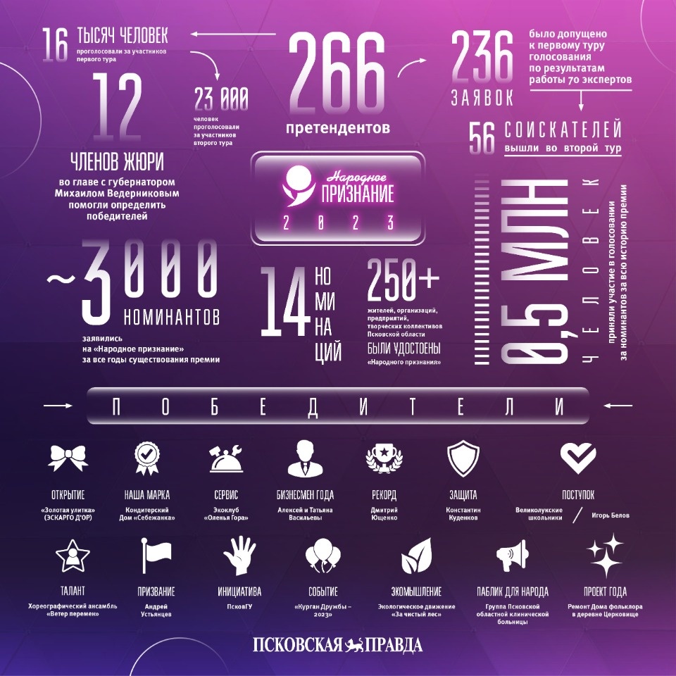 В Псковской области 29 февраля в 14-й раз вручили региональную общественную премию «Народное признание». Этому яркому событию предшествовал напряженный марафон протяженностью без малого три месяца: выдвижение претендентов, два тура голосования, работа экспертов и высокого жюри. «Псковская правда» подготовила инфографику, посвященную этому масштабному событию.