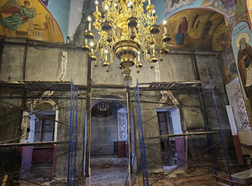 Специалисты также поделились, что после разбора иконостаса церкви Сорока Мучеников Севастийских на внутренней стене храма были обнаружены трещины.