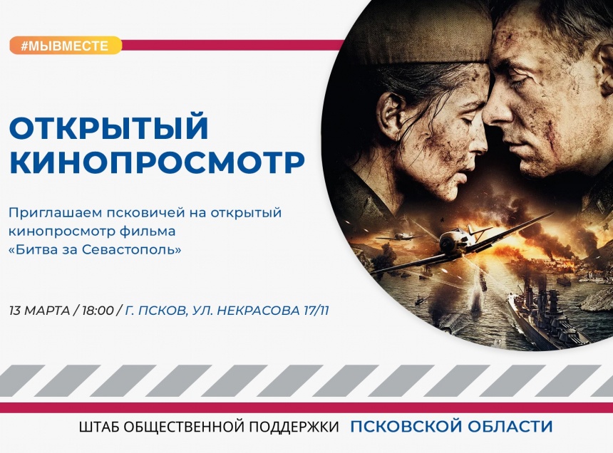 13 марта в штабе общественной поддержки в Пскове покажут фильм «Битва за Севастополь». Об этом сообщается в группе Штаба в соцсети «ВКонтакте».