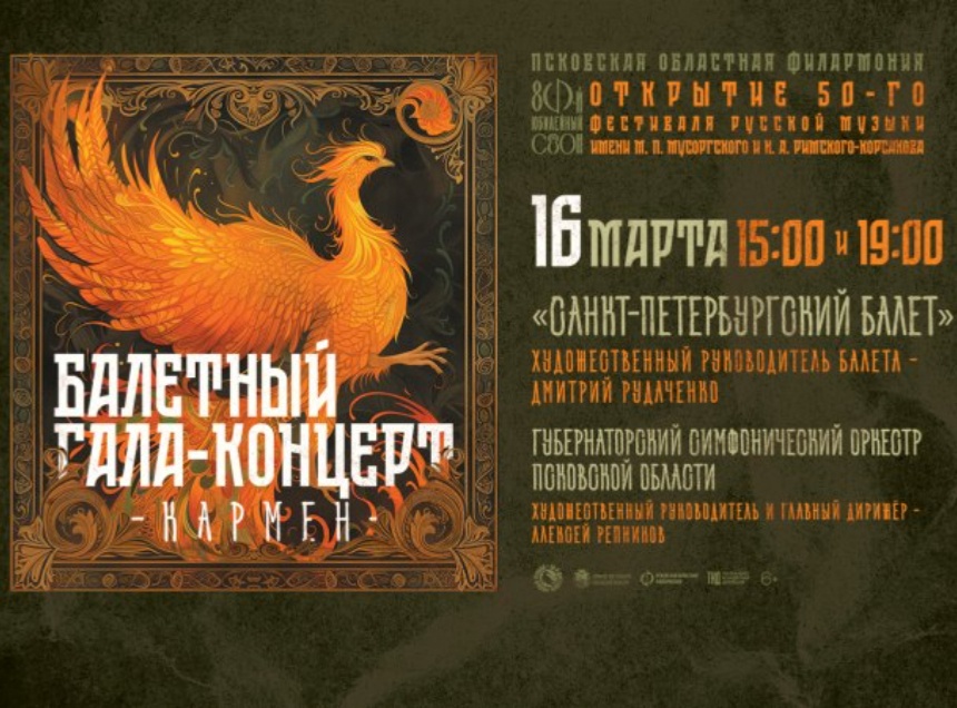 Премьерный показ гала-концерта и балета «Кармен-сюита» пройдет 16 марта в большом концертном зале Псковской областной филармонии. Мероприятие откроет 50-й Фестиваль русской музыки имени М. П. Мусоргского и Н. А. Римского-Корсакова.