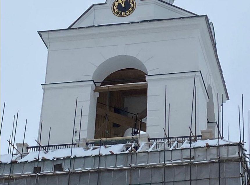 Работы стартовали по заказу АНО «Возрождение» в 2022 году. К осени 2023 года специалисты завершили благоустройство верхних ярусов – заменили стропильную систему, укрепили и оштукатурили стены, отреставрировали и покрыли позолотой часы и шпиль колокольни. Кроме того, были проинъектированы фундаменты и стены колокольни на нижних ярусах.