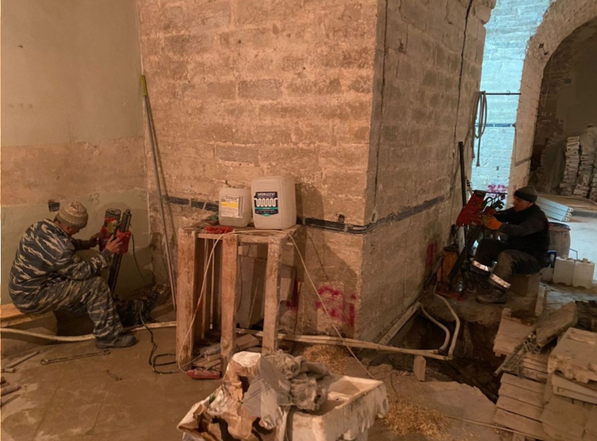«Используется материал с содержанием тонкомолотых наполнителей, полимеров. Это высокоподвижная смесь, способная проникать в пустоты и трещины менее 0,1 мм. Современный реставрационный материал не дает усадки во время набора прочности.», – отметили в АНО «Возрождение». Работы по инъектированию позволят сохранить исторический памятник.