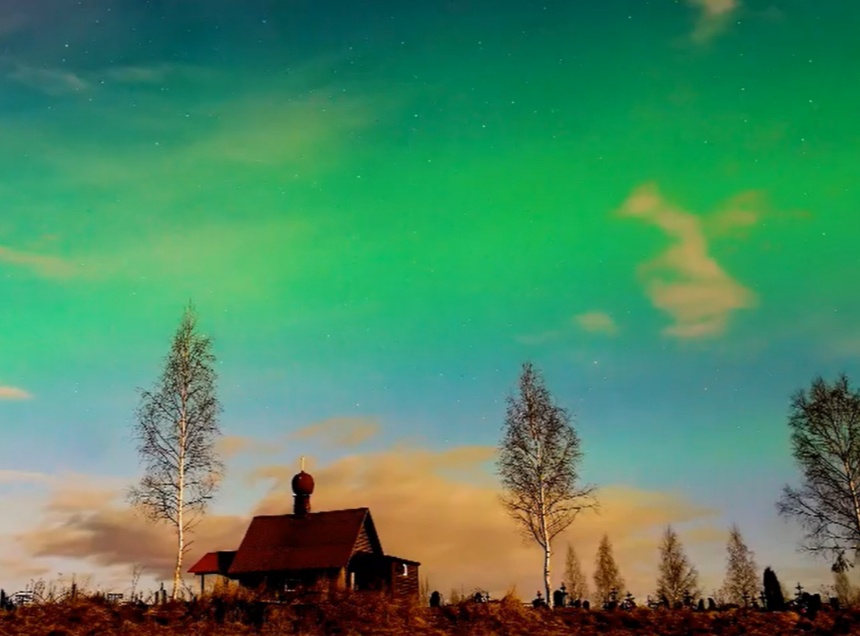 Астроном-любитель поделился, что запечатлеть полярное сияние на небе ему удалось около часовни в деревне Сенно Печорского муниципального округа.