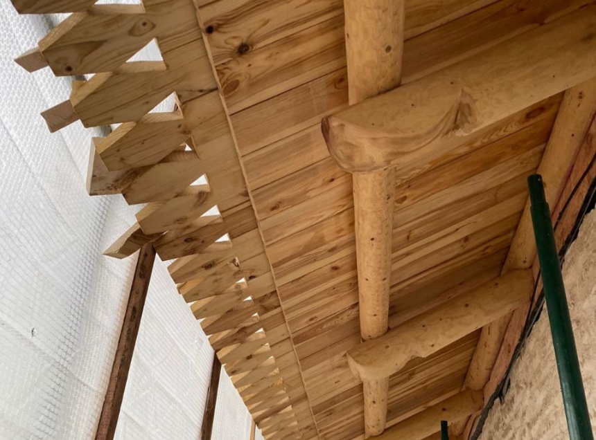 Специалисты также занимаются установкой стропильной системы и реставрационными работами внутри здания колокольни.