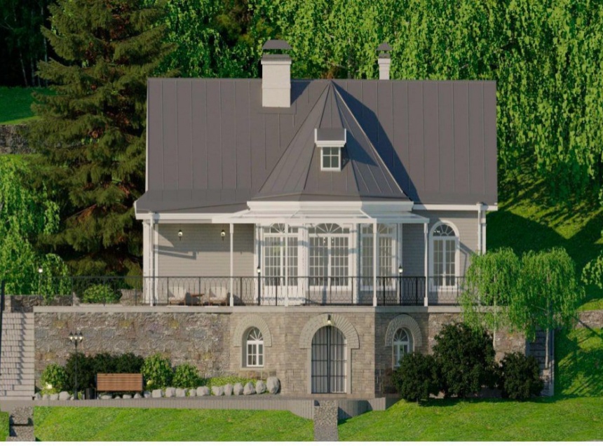 Деревянный дом с мезонином расположен недалеко от Псково-Печерского монастыря и построен на цокольном каменном этаже.