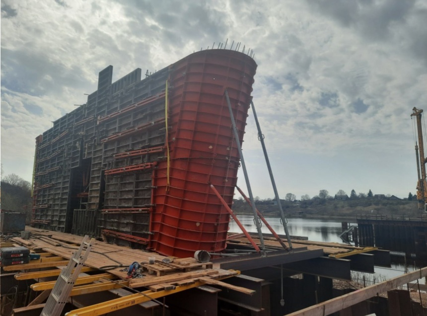 На данном этапе рабочие продолжают возведение промежуточных железобетонных опор моста через реку Великая, где готовят к монтажу металлическое пролетное строение.