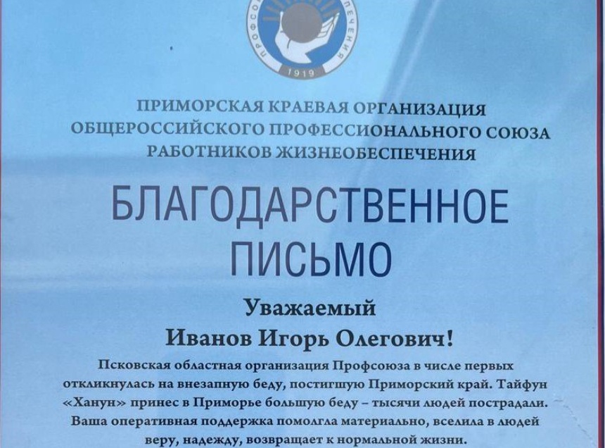В адрес Псковской областной организации профсоюза работников жизнеобеспечения поступило Благодарственное письмо от коллег из Приморского края за оперативную поддержку во время ликвидации последствий тайфуна «Ханун». Об этом «Псковской правде» сообщили в пресс-службе Псковского облсовпрофа.
