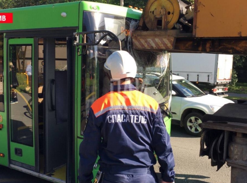 Автобус и кран столкнулись на автобусной остановке в Пскове. Об этом сообщает Телеграм-канал «Псковская сводка ПАИ».
