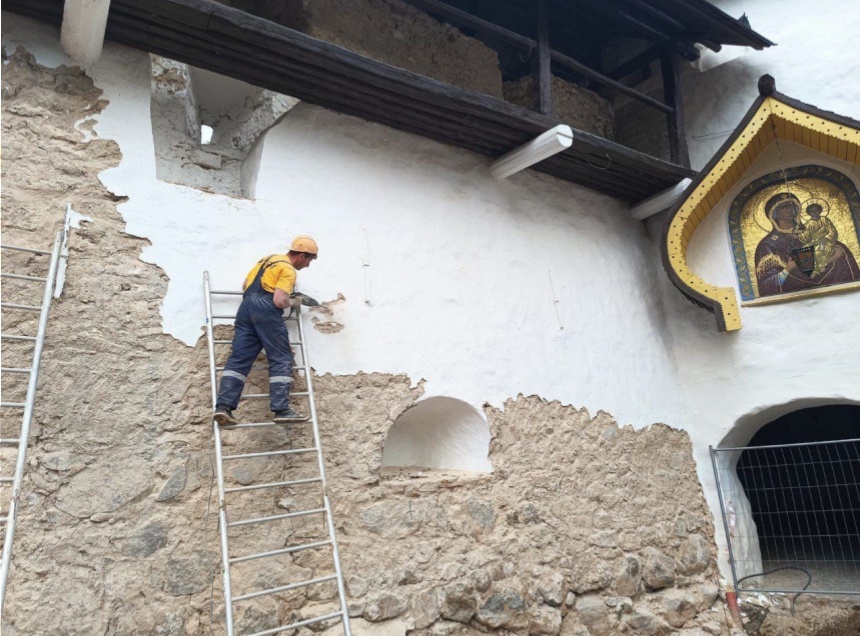 Работы проводятся снаружи и внутри монастыря. Специалисты удаляют штукатурный слой со стены на участке от башни Святых ворот до церкви Николы Вратаря.