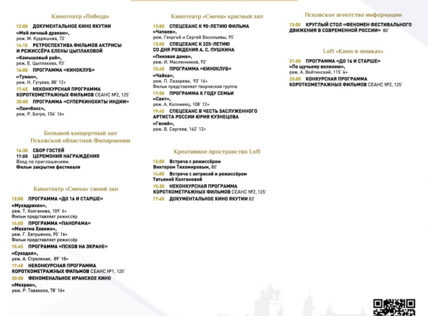 В Пскове начинается финальный день V Международного кинофестиваля «Западные ворота» в Пскове. 7 июля зрителей ждут киносеансы в кинотеатрах «Смена», «Победа» и креативном пространстве «Лофт», а также творческие встречи с режиссёрами Виктором Тихомировым и Светланой Колгановой в «Лофте».