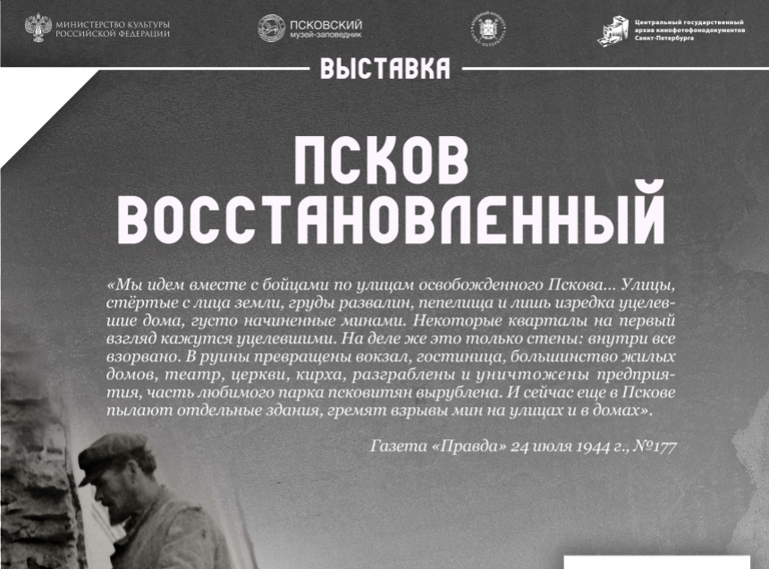 Выставка откроется 19 июля в 15:00 в главном здании музея, на улице Некрасова, 7. Экспозиция будет посвящена Пскову, разрушенному в годы войны, но восстановленному благодаря послевоенным мероприятиям и подвигу советских людей.