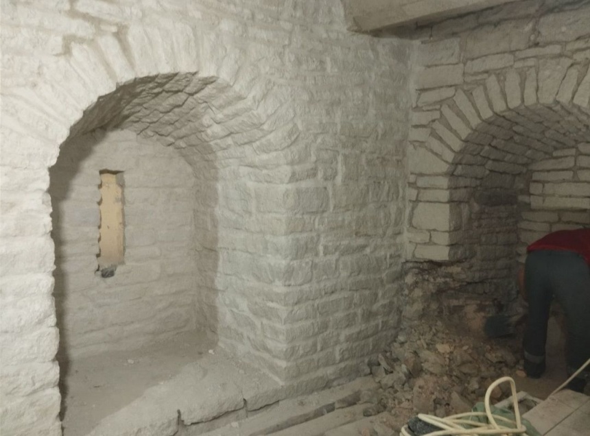 Внутри башни завершены работ по инъектированию и проводится отделка швов. Помимо этого укрепляются наружные стены и фундаменты башни со стороны въездных ворот.