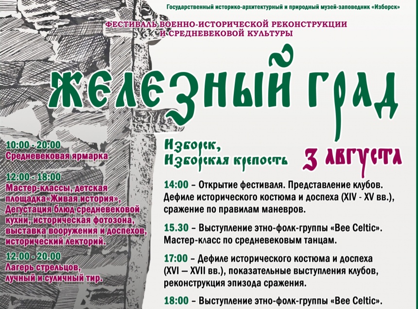 На фестивале военно-исторической реконструкции «Железный град», который пройдет в Изборской крепости 3 августа, выступит этно-фолк-группа из Санкт-Петербурга «Bee Celtic». Об этом «Псковской правде» сообщили в пресс-службе музея-заповедника «Изборск».