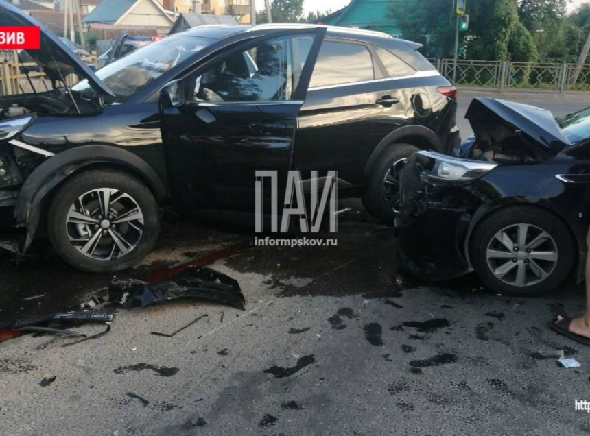 Внедорожник JAC и легковой автомобиль Kia столкнулись у дома №14 по улице Николая Васильева в Пскове в пятницу, 9 августа.
