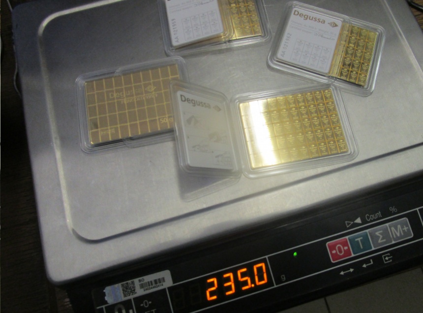 Таможенники осматривали машину и обнаружили в одном из шкафчиков металлические прямоугольные брикеты. При сканировании и досмотре багажа среди личных вещей были обнаружены слитки меньшего размера, промаркированные индивидуальными номерами и надписью «Degussa FEINGOLD 999,9». Вес партии составил 13 кг.