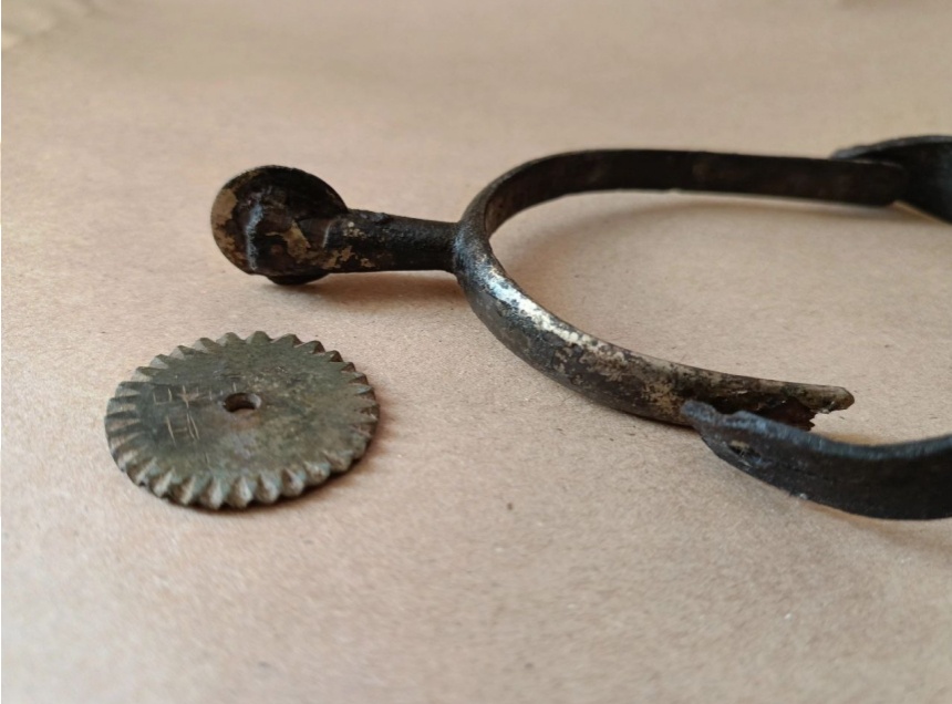 В подобной яме на раскопе Михайловский 2023 года в Пскове обнаружили бронзовую никелированную шпору с гладким колесиком, сохранившимися ремнями и пряжками крепления. Подобные шпоры использовались начальным составом Рабоче-Крестьянской Крестьянской Армии в 30-ые годы XX века.