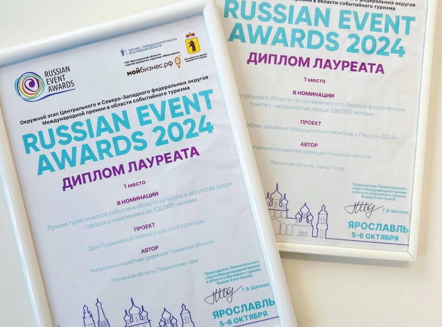 Проекты «Дни Пушкинский поэзии и русской культуры» и «Ярмарка яблок, урожая и традиционных напитков «Лешуга-2024» заняли первые места в номинациях «Лучшее событие в области культуры и искусства среди городов с населением до 100.000 человек» и «Лучшее событие в области гастрономического туризма в населенном пункте с численностью свыше 100.000 человек» соответственно.