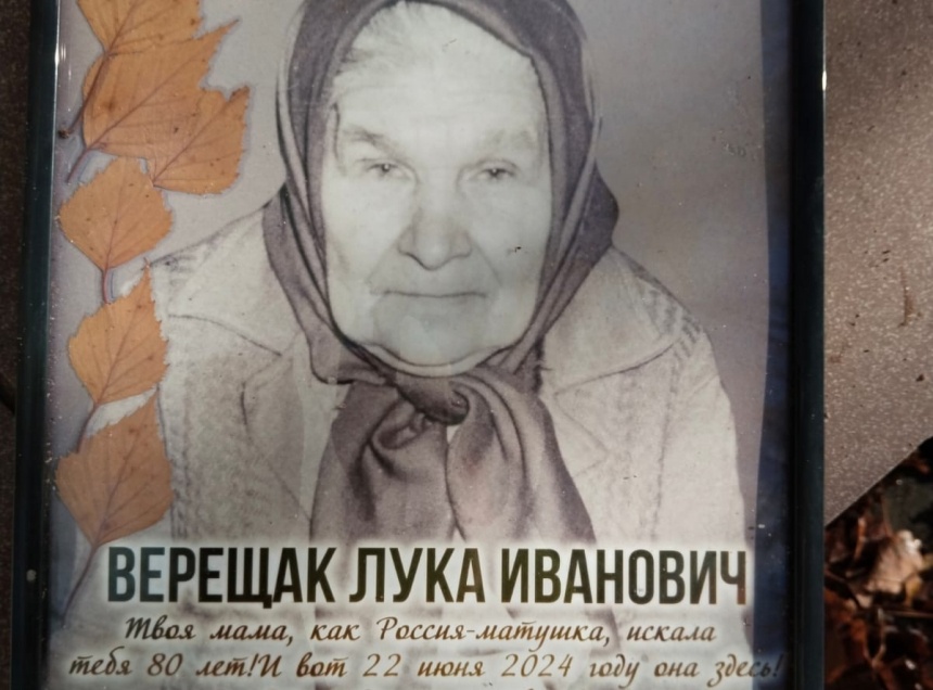 Помимо портера матери бойца виднелась надпись: «Верещак Лука Иванович. Твоя мама, как Россия – матушка искала тебя 80 лет! И вот 22 июня 2024 года она здесь! Это надо не мертвым! Это надо живым! Село Букреево-Плессо. Новосибирская область».