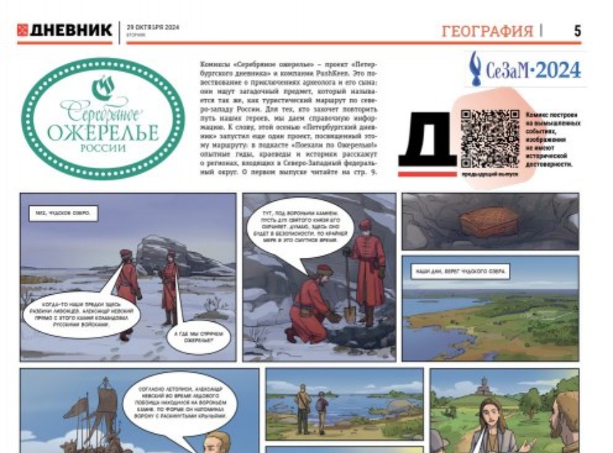 Серия комиксов «Серебряное ожерелье» – проект газеты «Петербургский дневник». Она рассказывает приключенческую историю о поиске таинственного артефакта, который назвали в честь турмаршрута по северо-западным регионам России.