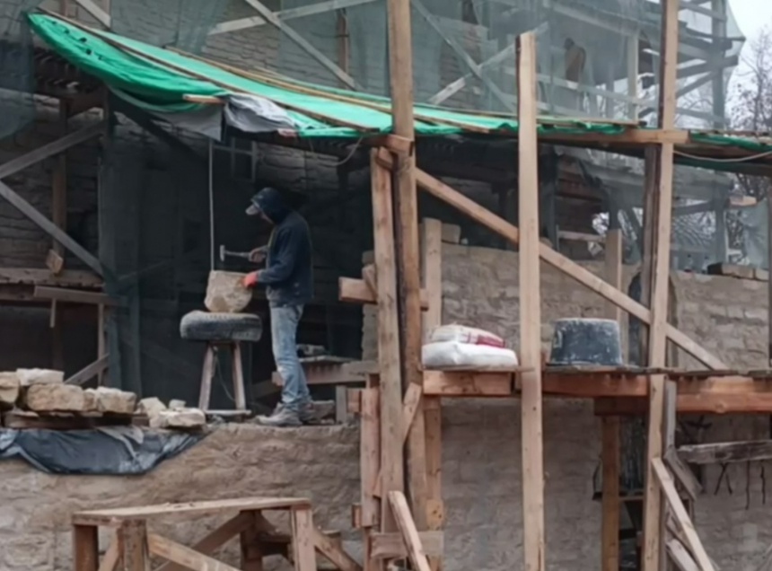 Работают с бутом, как и более 50 лет назад. Приемы работы с камнем не изменились, используется точно также ручной труд: подгонка и теска каждого камня для будущей кладки.
