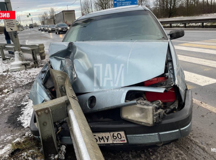 На светофоре за мостом через реку Великую автомобиль Skoda Octavia врезался в иномарку Volkswagen Passat и врезался в мостовое ограждение.