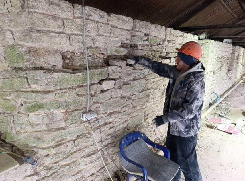 Так, были обработаны поверхности стен камнеукрепителем, заполнены швы шовным раствором и каменные кладки швов, расчищена каменная кладка швов в районе участка вывала, проведена вычинка каменной кладки и гидроизоляции отмостки.