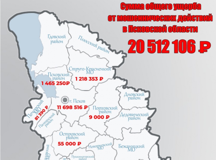 Больше всего от телефонных мошенников пострадали жители Пскова и Великих Лук. Там в результате действий злоумышленников местные жители лишились 11 млн 698 тысяч 516 рублей и 4 млн 754 тысячи 110 рублей соответственно. Жители Псковского района перевели «незнакомцам» 1 млн 465 тысяч 250 рублей, Стругокрасненского – 1 млн 218 тысяч 353 рубля, Новосокольнического – 1 млн 217 тысяч рублей.