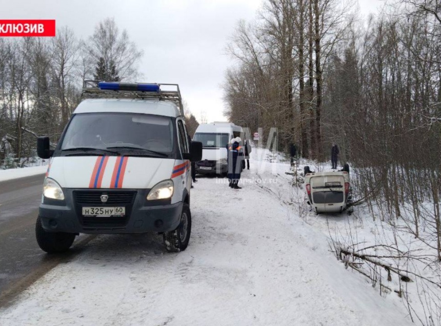 Маршрутный автобус и автомобиль Lada Largus столкнулись у деревни Ершово под Псковом. От удара легковушка вылетела в кювет и перевернулась.