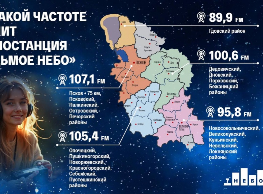 Напомним, радиостанция «7 НЕБО» вещает на территории муниципалитетов Псковской области и является единственной в регионе местной радиостанцией со столь широким охватом вещания.