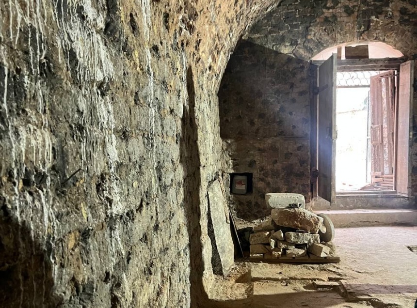В рамках гидрофобизации провели бурение узких отверстий (шурфов) на две трети толщины стен и сводов, усилили каменную кладку методом инъектирования, провели монтаж инъекционных пакеров и допрессовку инъекционными составами.