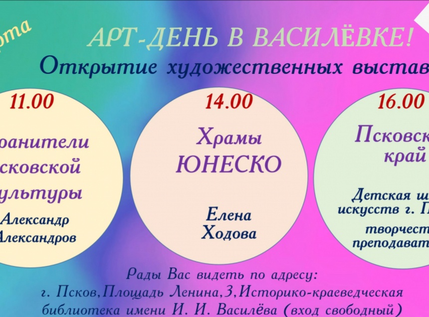 Арт-день состоится 16 марта в библиотеке имени И. И. Василева в Пскове. Как сообщили в Централизованной библиотечной системе города, в этот день в библиотеке откроются три выставки.