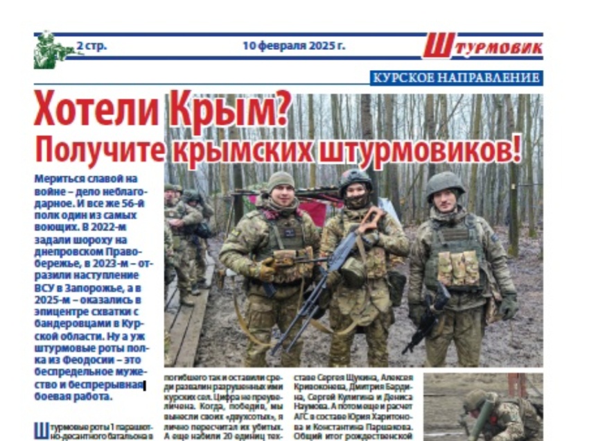 «Штурмовые роты полка из Феодосии – это беспредельное мужество и беспрерывная боевая работа. Считаю, залог успеха, с одной стороны, в мастерстве и мужестве наших парней-штурмов, а с другой – в приобретённой в бесконечных боевых действиях слаженности работы разных спецов боевого обеспечения», – отмечает автор статьи.