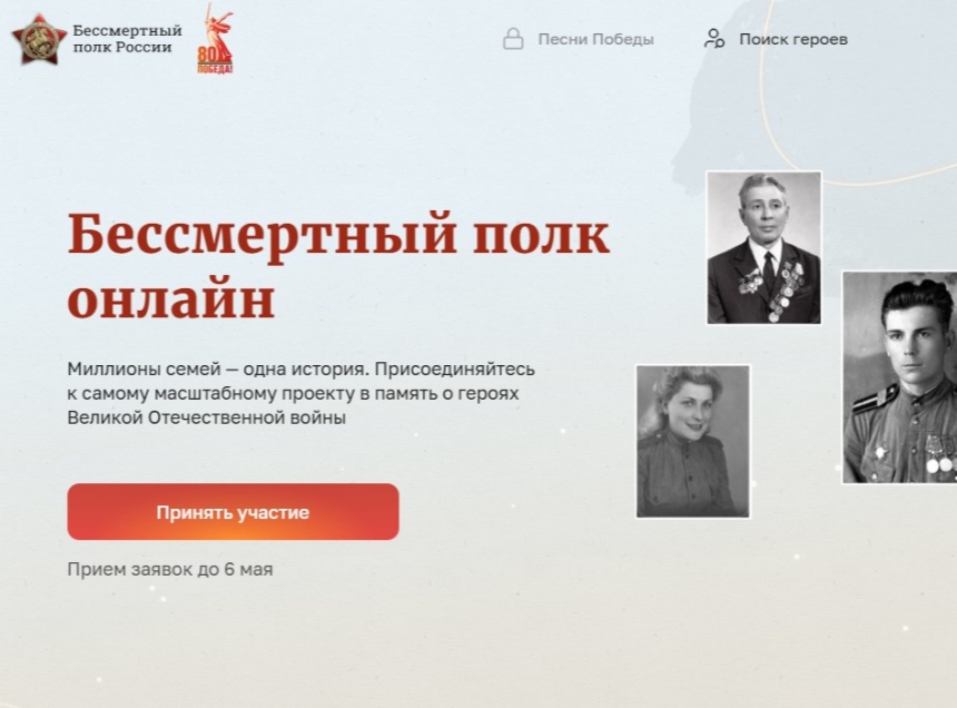 Всероссийская акция «Бессмертный полк России онлайн» проводится с 23 апреля. Принять участие в ней может любой желающий. Для этого до 6 мая нужно разместить фото ветерана Великой Отечественной войны или труженика тыла. Загрузить его можно на сайте Бессмертного полка РФ, в мини-приложениях ВК и в Одноклассниках.