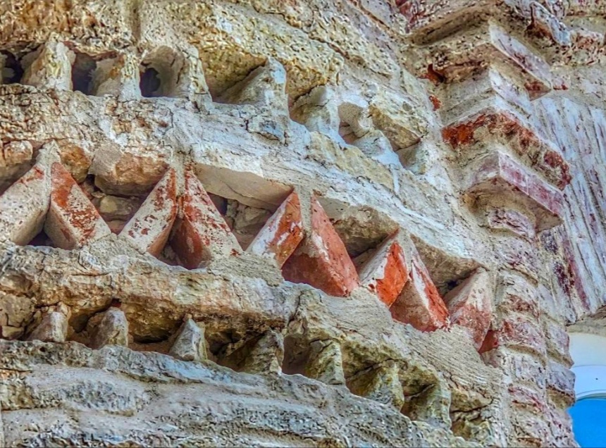 «Поребрик – тип орнаментальной кирпичной кладки, при которой один ряд кирпичей укладывается под углом к поверхности стены, ребром наружу. Рядом с такой «зубчатой» полосой вилась «ёлочка» бегунца – древнерусские зодчие ценили этот узор из обычного кирпича или плиты, опоясывая им барабаны куполов и полукружия апсид», – прокомментировали в пресс-службе печерской обители.