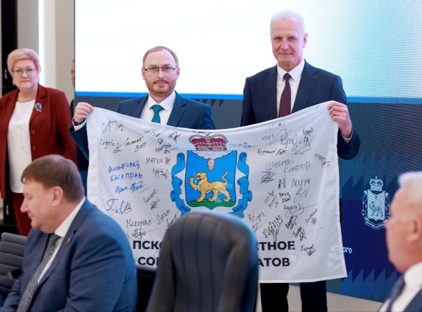 «Этот флаг будет храниться в Псковском областном Собрании депутатов, потому что все мы делаем одно общее дело. Мы с вами поддерживаем и будем поддерживать наших бойцов до самой Победы», – подчеркнул спикер парламента Александр Котов.