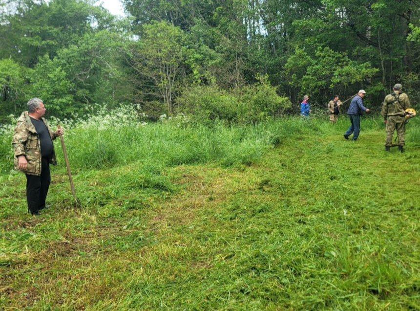 В этот день представители поискового отряда «Поиск» и молодежного отряда «Грифон» подготовили площадку, где в дальнейшем разместится полевой лагерь: скосили траву, а также обработали территорию от комаров и клещей.