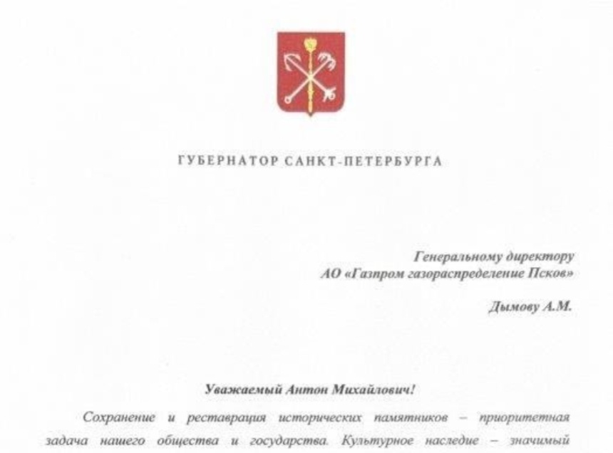 Коллектив «Газпром газораспределение Псков» отметили благодарственным письмом губернатора Санкт-Петербурга Александра Беглова, сообщил гендиректор ООО «Газпром межрегионгаз Псков» – управляющей организации АО «Газпром газораспределение Псков» Антон Дымов на своей странице в соцсети «ВКонтакте».