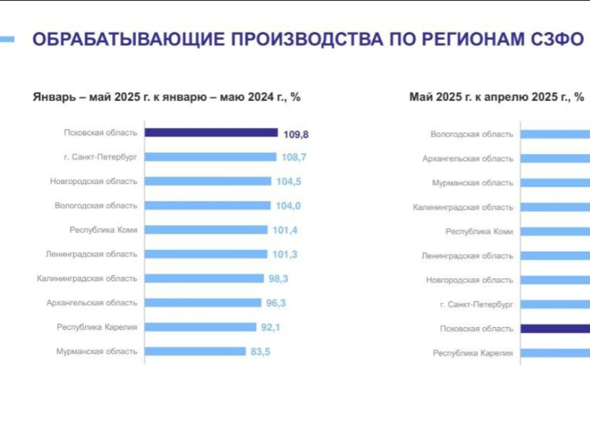 В сфере обрабатывающих производств у Псковской область самый лучший показатель – 109,8%. По сравнению с аналогичным периодом 2024 года самые большие показатели зафиксировали в производстве машин, электротехнического оборудования и мебели.