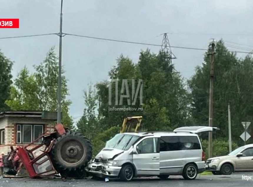 Микроавтобус и трактор МТЗ столкнулись на перекрестке с трассой М-9 «Балтия». Трактор ехал из центра Куньи, а Volkswagen – со стороны великих Лук.