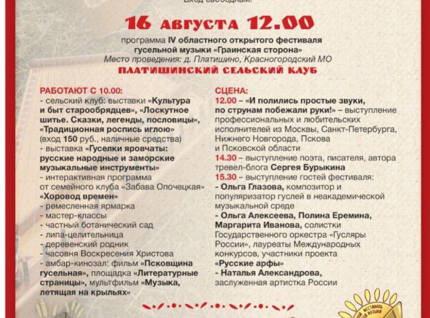 Более 100 гусляров выступят в рамках областного фестиваля «Граинская сторона» в деревне Платишино в Красногородском районе 16 августа. Об этом сообщает официальный Телеграм-канал Псковской области.