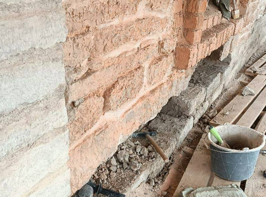 Оконные проемы восстанавливаются и перекладываются заново, при этом удаляется кладка, выполненная в 60-е годы прошлого века с использованием цемента.