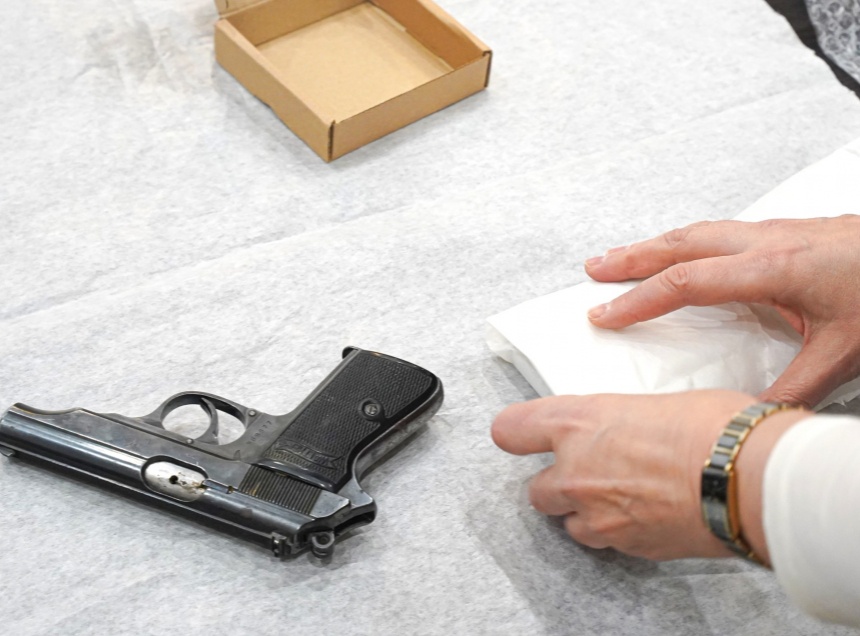 Второй предмет – трофейный пистолет Walther PP с гравировкой: «Пистолет генерала Стученко А.Т., взятый в бою 30.07.1943 г. Номер пистолета 969877».