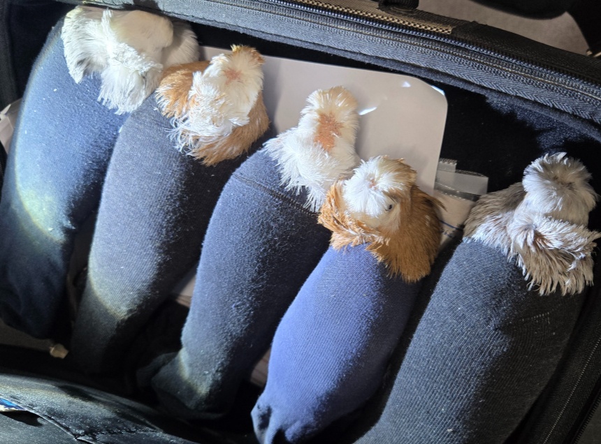 Автомобиль пытался въехать в Россию через МАПП «Убылинка». Помещенных в носки птиц обнаружили среди личных вещей водителя - иностранного гражданина. Обездвиженные голуби плотно лежали в небольшой чемодане в кабине.