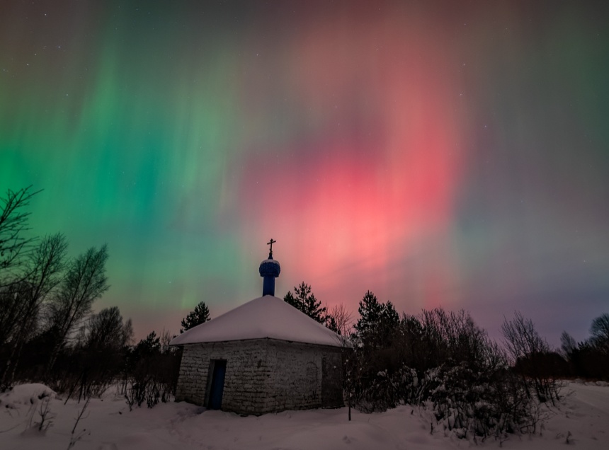 Яркое полярное сияние он сфотографировал в небе над Успенской часовней. Съемка прошла в ночь на 20 января при температуре до -17 градусов.