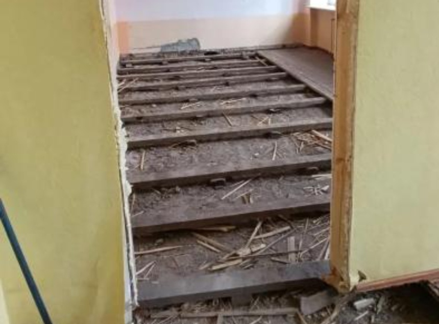 Специалисты демонтировали старые двери во многих помещениях. Сейчас разбираются и вывозятся изношенные напольные покрытия. Демонтаж поможет оценить реальное состояние конструкций и подготовить помещения к следующим этапам ремонта.